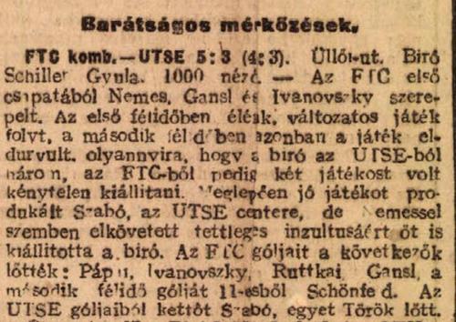 1918.XII.22. FTC kombinált – UTSE 5:3 (edzőmérkőzés)