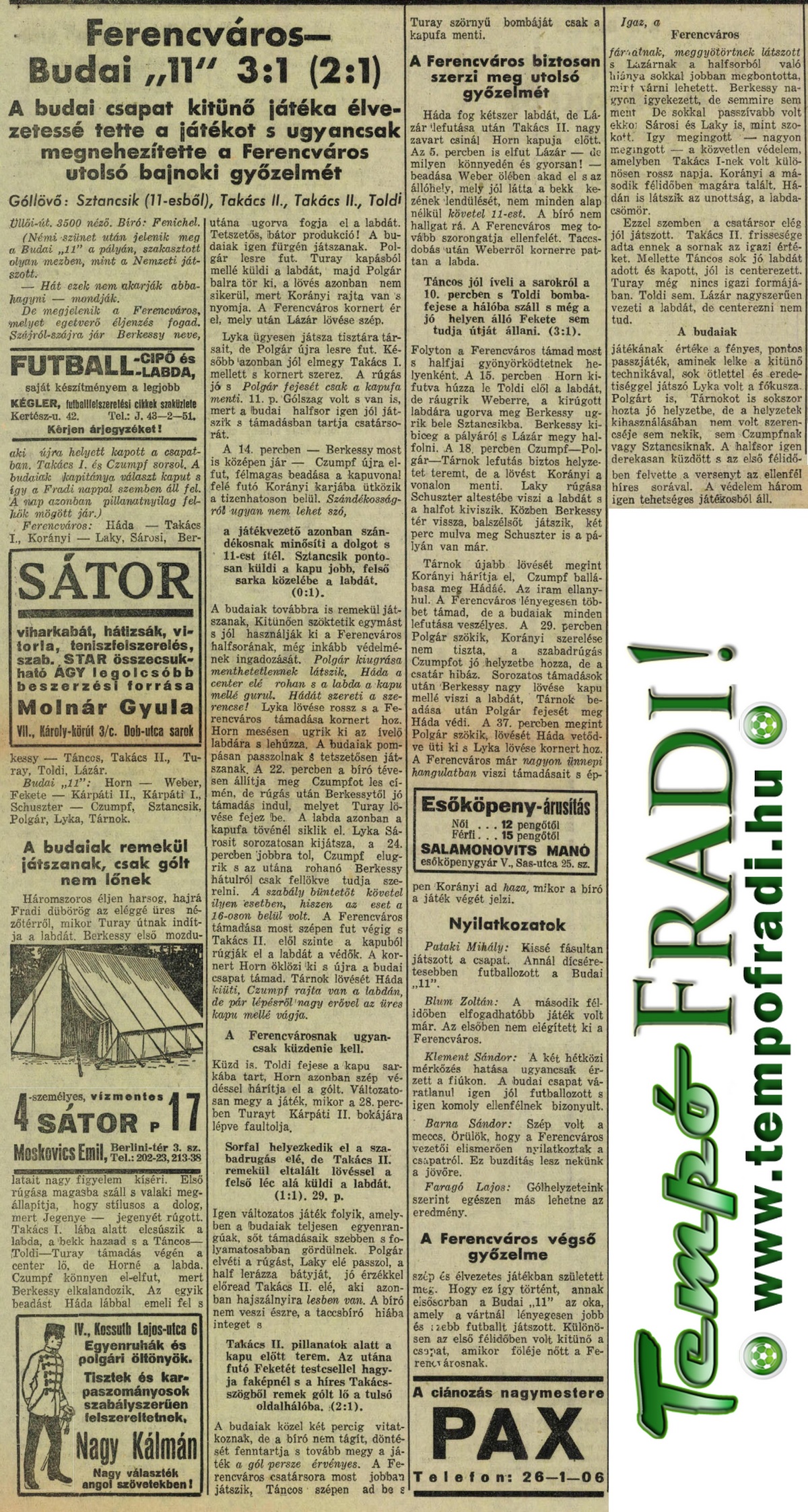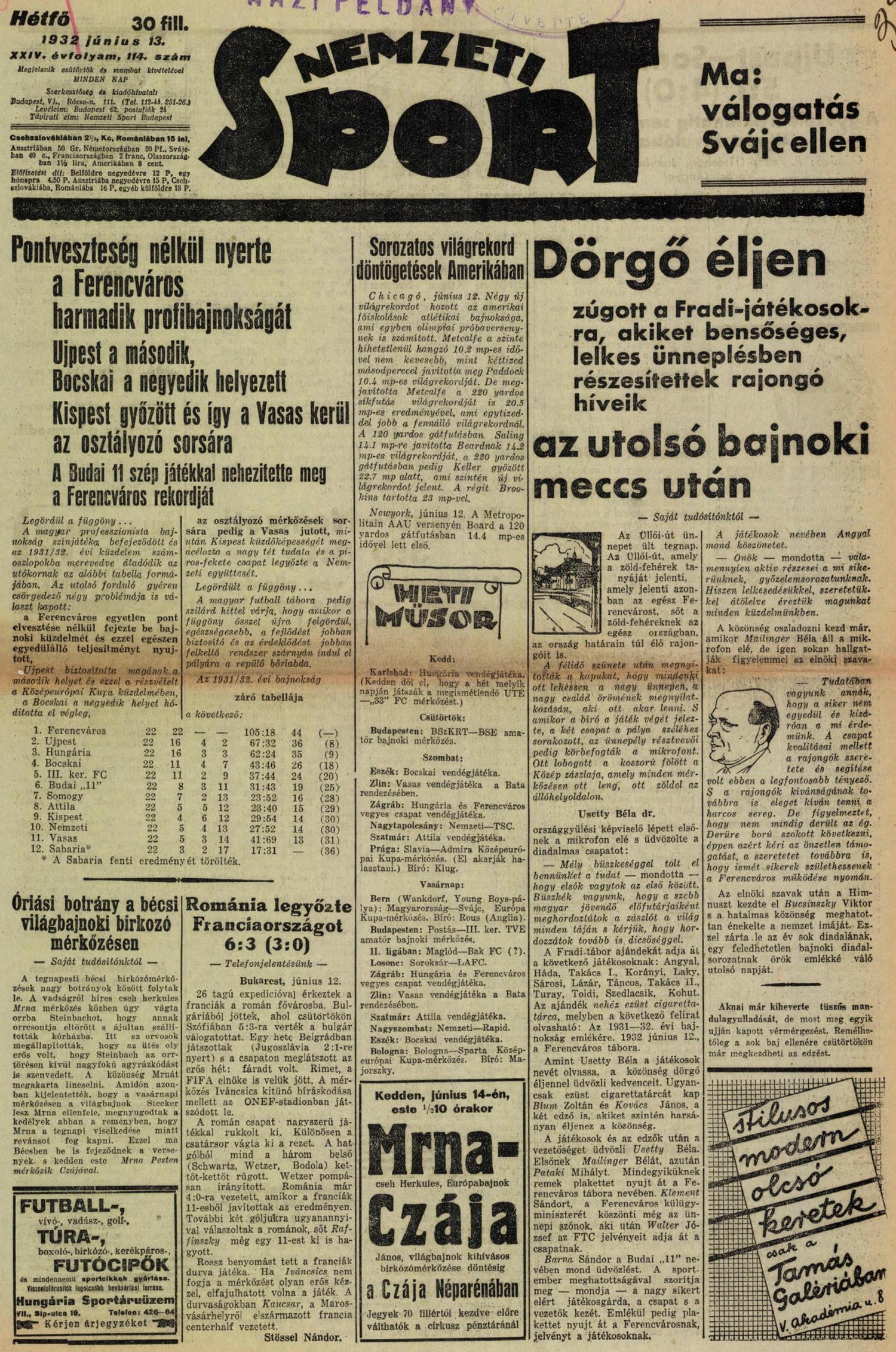 1932.VI.12. Ferencváros – Budai „11” 3:1 Közzétéve: 2009. február 1. vasárnap | Szerző: K@rcsi Pontveszteség nélkül nyerte a Ferencváros harmadik profibajnokságát A budai csapat kitűnő játéka élvezetessé tette a játékot s ugyancsak megnehezítette a Ferencváros utolsó bajnoki győzelmét Vélemény, hozzászólás? Válasz megszakításaAz e-mail címet nem tesszük közzé. A kötelező mezőket * karakterrel jelöltük Hozzászólás * Név * E-mail cím * Honlap Δ