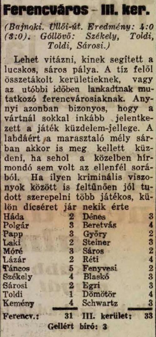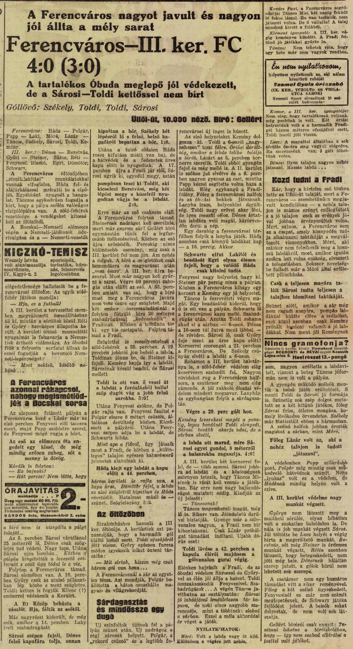 1934.III.18. Ferencváros – III. ker. FC 4:0 Közzétéve: 2009. február 3. kedd | Szerző: K@rcsi A Ferencváros biztosan szerezte meg a bajnoki pontokat A Ferencváros nagyot javult és nagyon jól állta a mély sarat Vélemény, hozzászólás? Válasz megszakításaAz e-mail címet nem tesszük közzé. A kötelező mezőket * karakterrel jelöltük Hozzászólás * Név * E-mail cím * Honlap Δ
