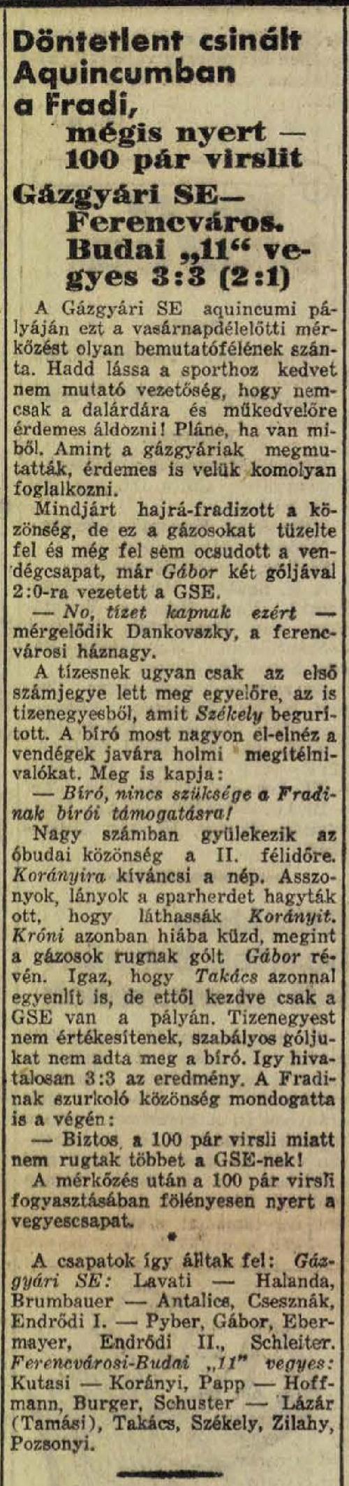 1934.IV.15. Gázgyári SE – Ferencváros, Budai „11” vegyes 3:3 (edzőmérkőzés)