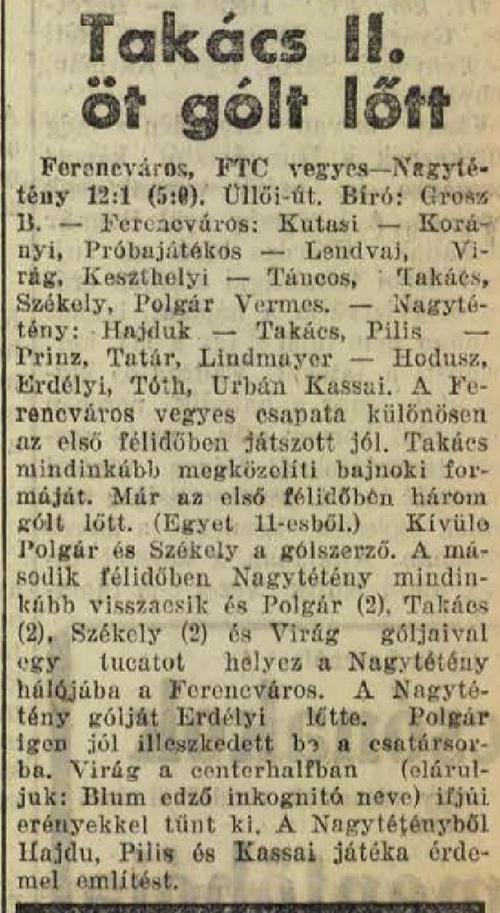 1934.IV.29. Ferencváros, FTC vegyes – Nagytétény 12:1 (edzőmérkőzés)