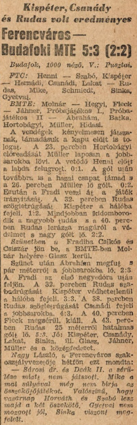 1947.IX.14. Budafoki MTE – Ferencváros 3:5 (edzőmérkőzés)