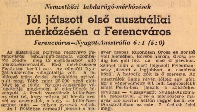 1957.VI.29. Nyugat-Ausztrália – Ferencváros 1:6