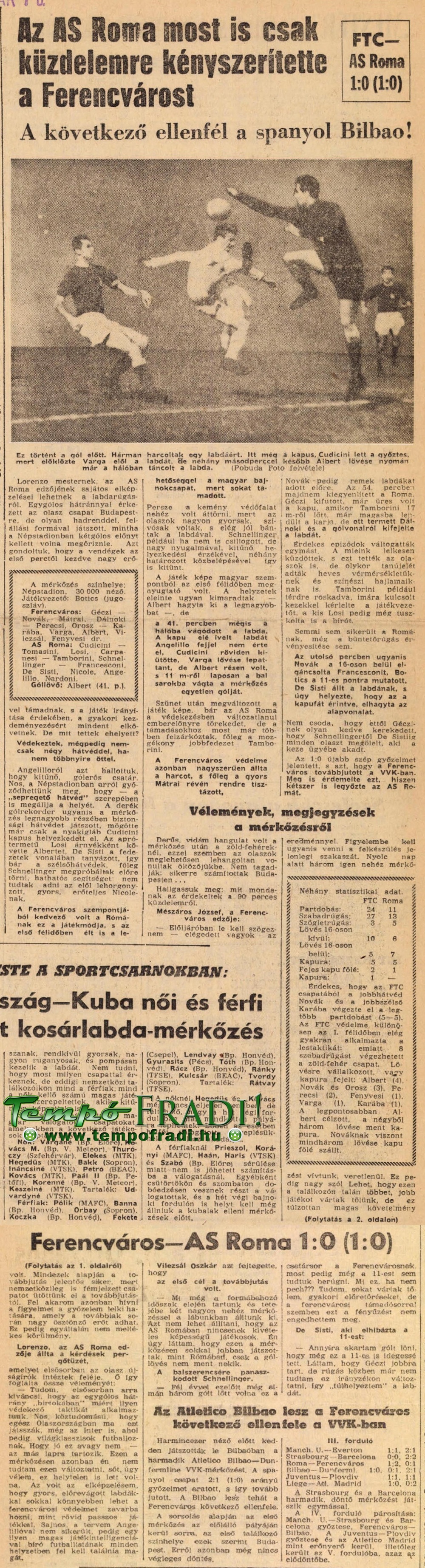 Azért ezt a főcímet olvasni ma, 2016-ban („Az AS Roma most is CSAK küzdelemre kényszerítette a Ferencvárost”) – hátborzongató … „következik a Bilbao … Igen, sajnos már kb. 50 éve, hogy úgy lépdeltünk át egy-egy olasz, spanyol, angol stb. élcsapaton, mint manapság a Barca egy Getafén vagy Levantén … 😛 🙁