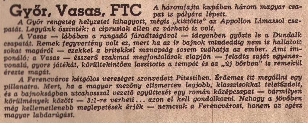 1967.09.20., Pitesti: Arges Pitesti – Ferencváros: 3-1, VVK 1. forduló 1. mérkőzés