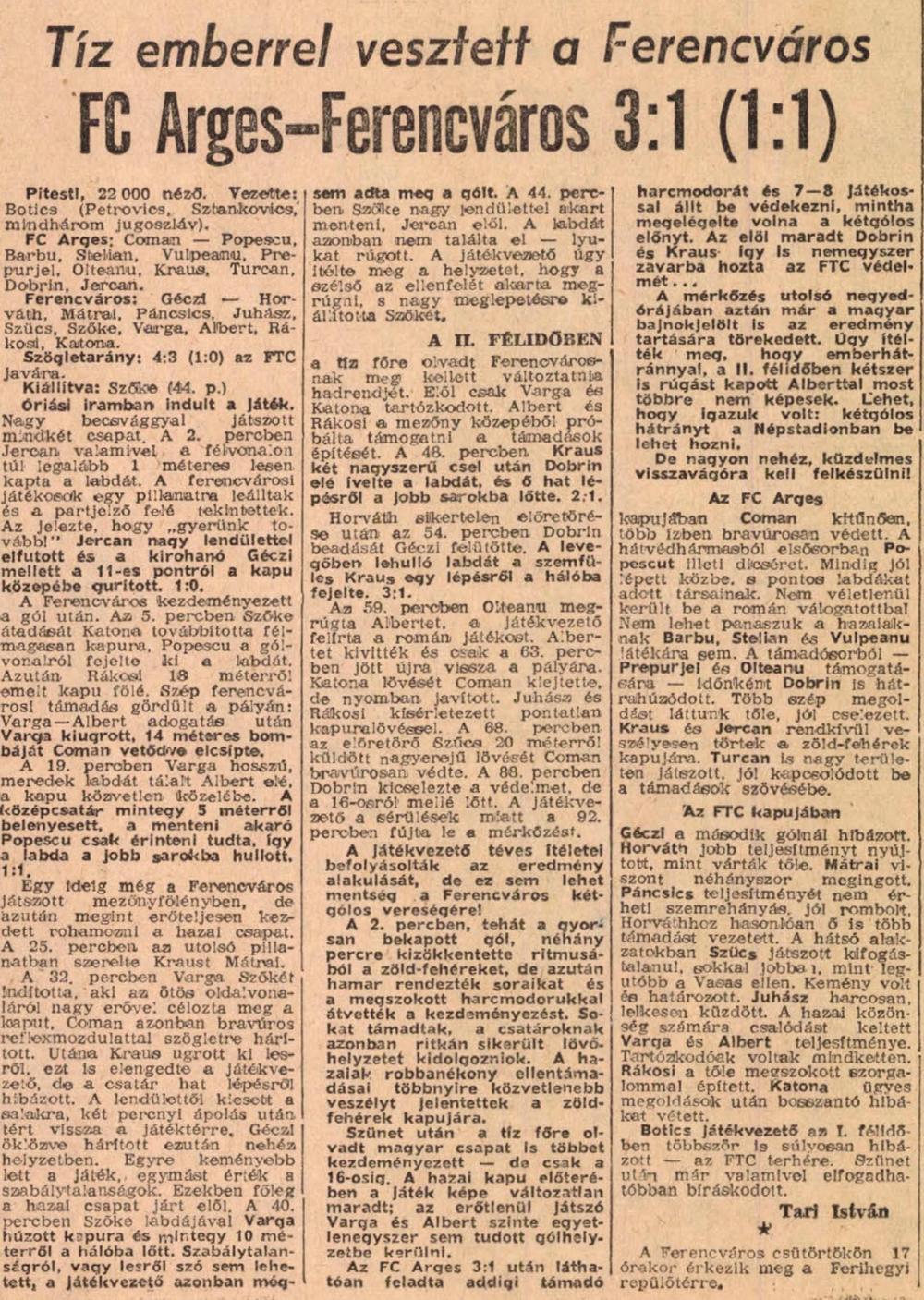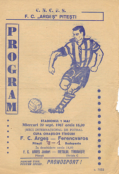 - 1967.09.20., Pitesti, Arges Pitesti – Ferencváros: 3-1, VVK