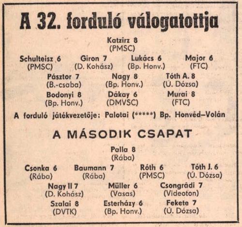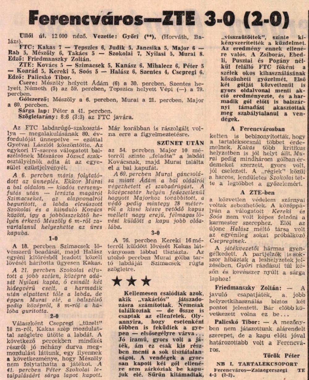 Felvételünkön (Almási László felvétele) az összecsapás egyik legjobb embere, Murai, aki mindhárom hazai gólban tevékenyen részt vállalt (egyet lőtt, kettőt előkészített), Kanásszal harcol a labdáért. Ferencváros-ZTE 3-0.