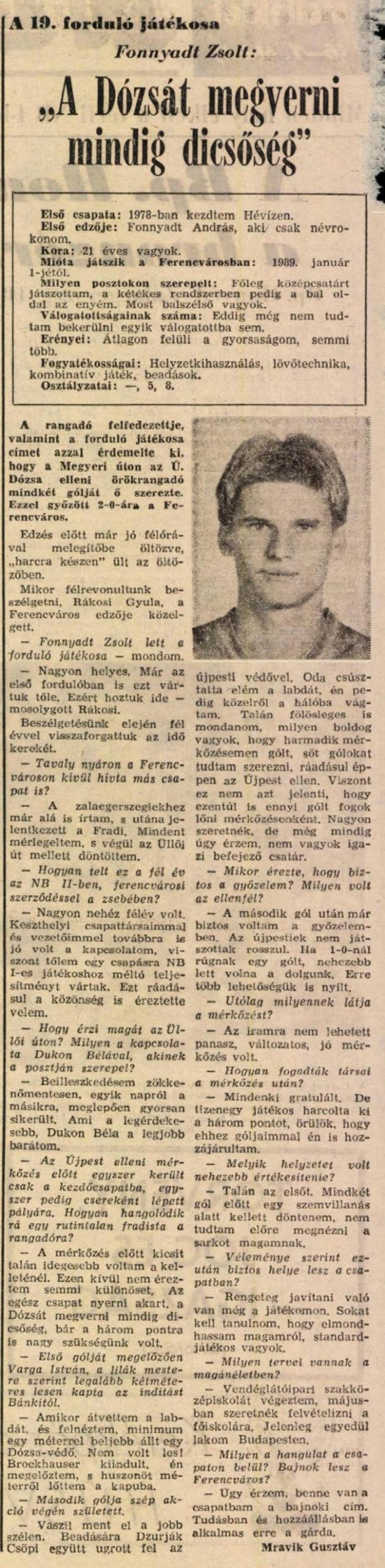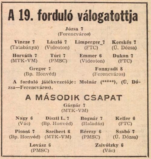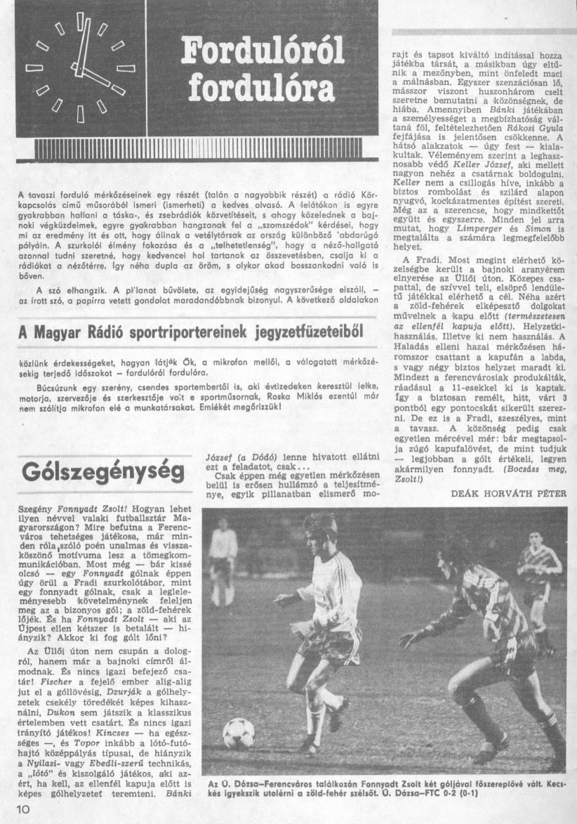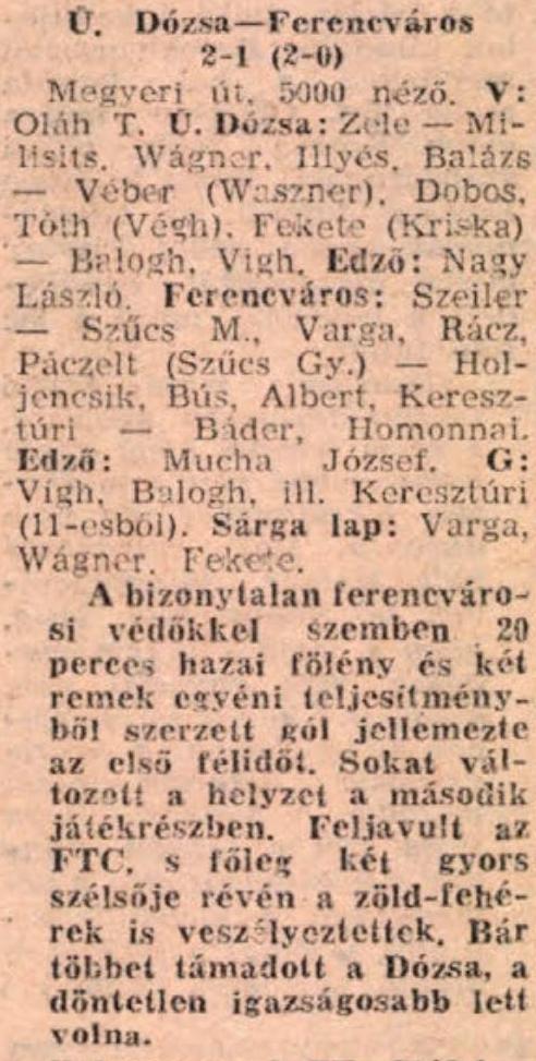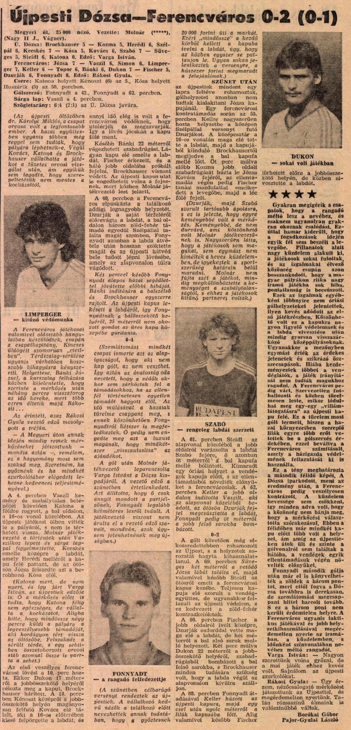 Anakronisztikus látványt nyújtott szombat este a Megyeri úti stadion, utoljára talán akkor volt teltház a Dózsa-pályán, amikor még Bene, Fazekas és Dunai II. ontották a gólokat a lila-fehér színekben. Pedig nem is volt igazából rangadó a Ferencváros és az U. Dózsa mostani összecsapása, mert bár a zöld-fehérek vezetik a tabellát, a Dózsa csak a 14. helyen szerénykedik. Az első félidőben mégsem látszott meg a 13 hely különbség, mert többnyire a hazaiak irányították a játékot. Ám már ekkor is több veszélyt jelentettek a ferencvárosi megugrások, amelyek közül Fonnyadt két kirobbanása volt a legfigyelemreméltóbb. Az elsőt a 40. percben még elrontotta a fiatal csatár, két percre rá azonban már 25 méterről a kifutó Brockhauser mellett biztosan helyezett a sarokba (1:0). Meg kell hagyni, kissé lesgyanús volt az akció, ezt Varga István, a Dózsa edzője is szóvá tette, amiért Molnár játékvezető leküldte őt a kispadról.