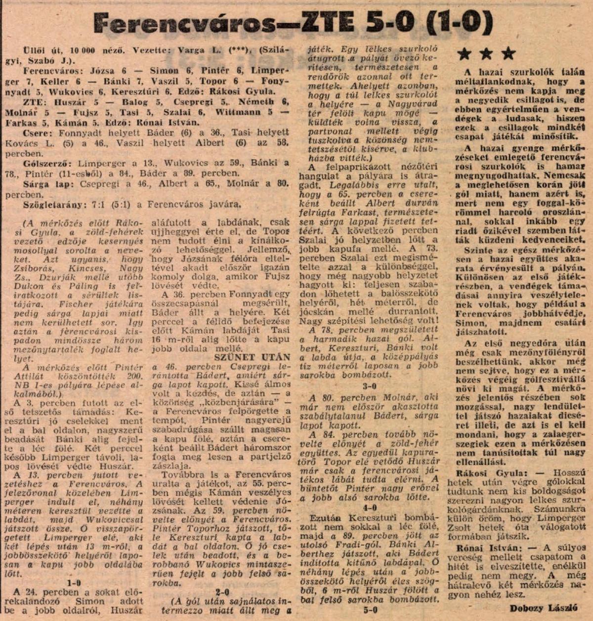 Úgy tűnt, az esőre hajló idő sokakat elriasztott az Üllői úti csatától, vagy úgy hitték a távolmaradók, hogy a Ferencváros simán nyer a kieső zónától menekülő ZTE ellen. Akár ez az ok, akár az, mindössze harmadnyi ház fogadta a dobogóra törekvő zöld-fehéreket, akik soraiban Pintér 200. NB I-es találkozóját játszotta. Nem csak klubja vezetői, de a zalai csatárok is köszöntötték. Előbbiek ajándékkal, utóbbiak pedig azzal, hogy alig adtak neki munkát az első félidőben. A hazaiak két részre osztották az első 45 percet. Mintegy húsz percen keresztül csakis a földön járatott labdákkal, pontos, higgadt összjátékkal operáltak, és mindezt a ZTE tétlenül, közelről szemlélte. A jó adogatások gyümölcse a 13. percben érett meg, amikor Limperger Wukoviccsal kényszerítőzött. Úgy tűnt, Limperger hosszan szökteti magát, de nem, még utolérte a labdát, és ha már utolérte, akkor mintegy 8 méterről ügyesen a kapu jobboldalába is gurított. Később a vidékiek is feljebb merészkedtek, elhagyták 16-osuk környékét, de komoly egyenlítési lehetőségük nem adódott. A 44. percben Kámán ügyesen gurított vissza a felrobogó Tasi elé, akinek 24 méteres, lapos bombája kevéssel kerülte el a jobb alsó sarkot.