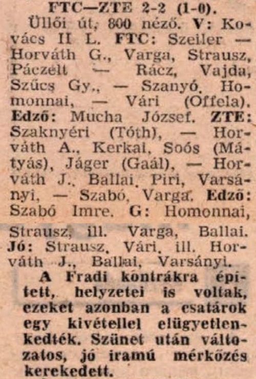 ZTE: Huszár – Balog, Csepregi, Németh, Molnár – Fujsz, Tasi (Kovács L. 46.), Szalai, Wittmann – Farkas, Kámán (Pumer 68.)