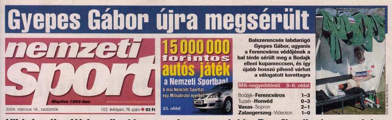 Gyepes Gábor a szünetben magába roskadtan, egyedül ült a kispadon, egy hatalmas kötéssel a bal térdén. Védőnk elmondta, hogy egy ütközés után ellenfele ráesett a térdére és most is komoly fájdalmai vannak. A futballista bízik benne, hogy „csak” kicsit megnyúltak a szalagok. Gyepit a mérkőzés után a Sportkórházba viszik kivizsgálásra. A meccsre nem nevezett játékosaink közül Tököli és Zováth érkeztek a kispadhoz, próbálják vigasztalni Gyepit, aki azt mondta, úgy érzi, mintha „lötyögne a térde” és ez nem jó jel.