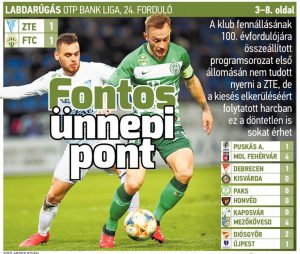 A Ferencváros 1–1-es döntetlent játszott a fennállása 100. évfordulóját épp a zöld-fehérek elleni bajnokit megelőzően megünneplő ZTE otthonában. A hazai együttes a második félidőben több óriási helyzetet is kialakított, Dibusz Dénes ezeknél még védeni tudott, ám a 80. percben az exferencvárosi Radó András büntetőjével szemben már ő is tehetetlen volt.