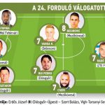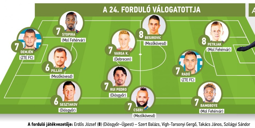 | Demjén (ZTE) 7 — Sesztakov (DVTK) 6, Pillár (Mezőkövesd) 6, Stopira (MOL Fehérvár) 7 — Cseri (Mezőkövesd) 7, Rui Pedro (DVTK) 7, Varga K. (DVSC) 7, Besirovic (Mezőkövesd) 8 — Bamgboye (MOL Fehérvár) 7, Radó (ZTE) 7, Petrjak (MOL Fehérvár) 8 A forduló játékvezetője: Erdős József (DVTK — Újpest) 8 — Szert Balázs, Vígh-Tarsonyi Gergő, Takács János, Szilágyi Sándor |