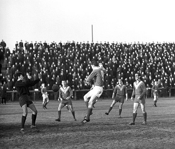 Varga Zoltán beadásából a kimozduló Szilágyi Gyula kapus mellett Albert Flórián gólt fejel, a Ferencváros-Bp. Előre labdarúgó-mérkőzésen.