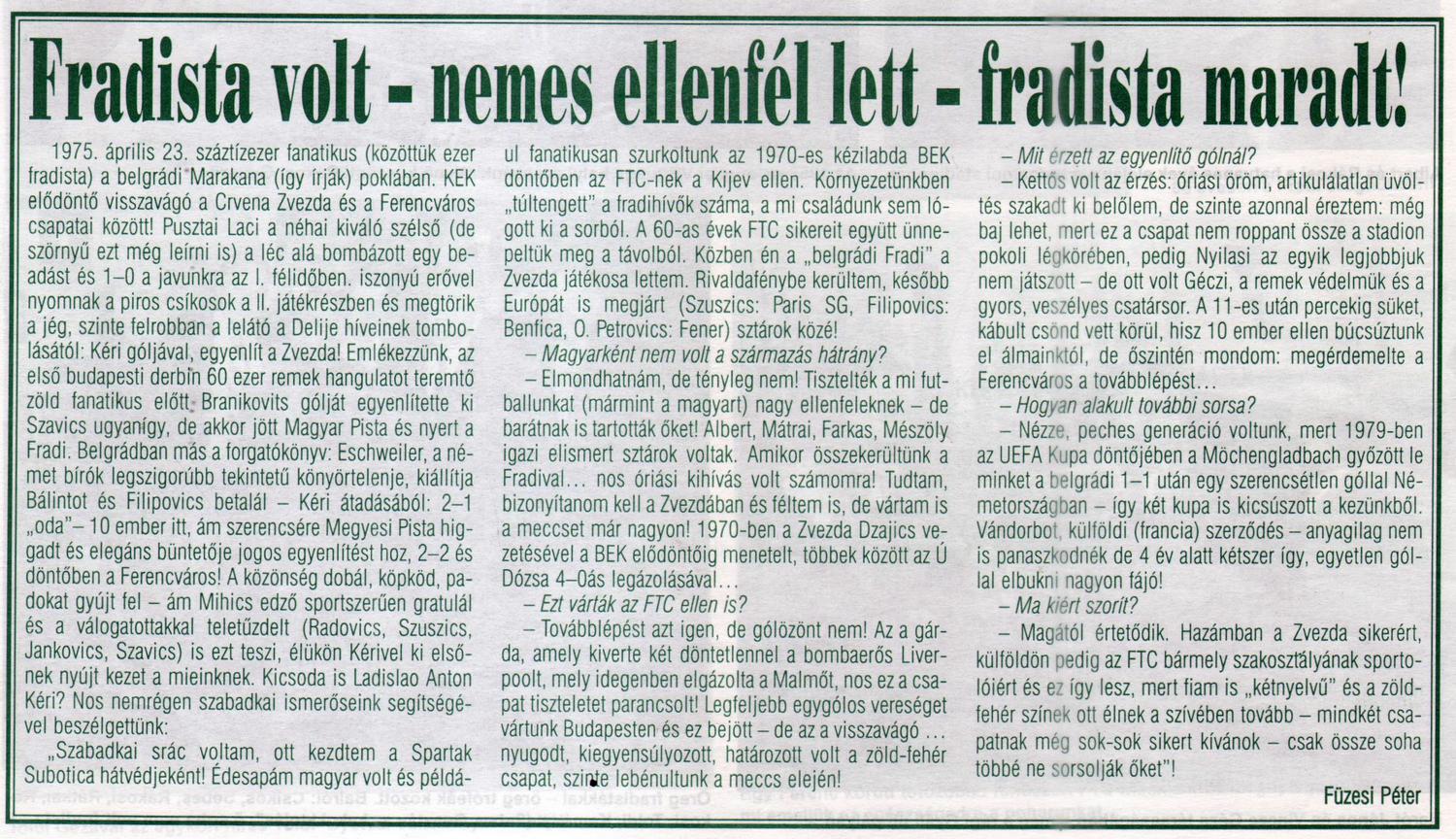 A személyes kis kitérő után a mérkőzésnek volt még egy pikantériája. A Crvena Zvezda játékosai között volt egy szabadkai srác, Ladislao Anton Kéri, akinek édesapja magyar volt és fanatikus Fradi szurkoló. Számára egy nehéz feladat, egy különleges élmény volt ellenfélként azon a felejthetetlen mérkőzésen pályára lépni.