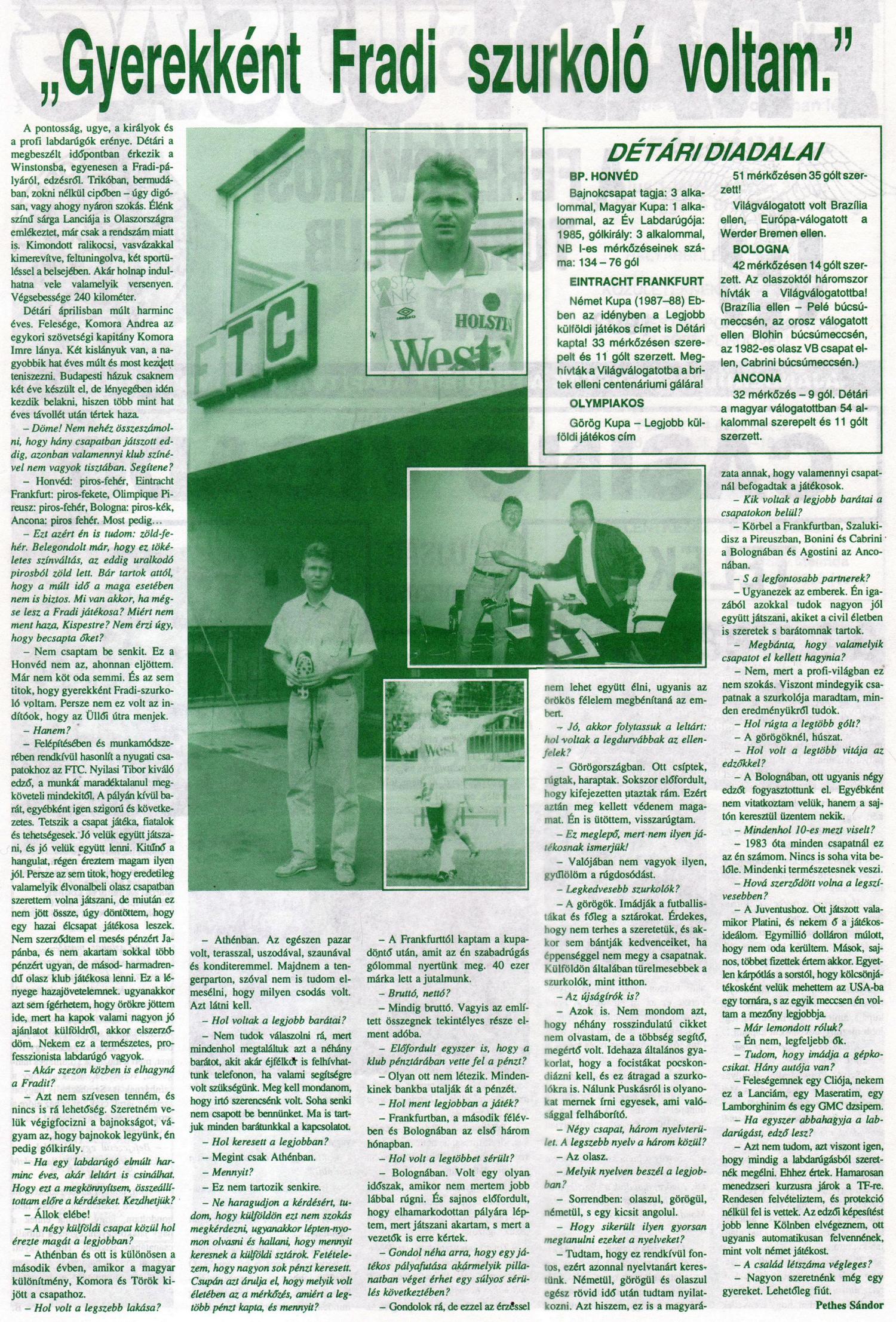Az idei nyár kétségkívül legnagyobb igazolása Détári Lajosnak a Ferencvároshoz való szerződése. A csütörtökön aláírt megállapodás szerződés értelmében a válogatott labdarugó egy évig a zöld-fehérek tizese lesz. Az FTC elengedi ugyan a játékost, ha igazi sztárcsapat jelentkezik érte, de ez is csak akkor lehetséges, ha a csapat már kiesett a KEK-ből.