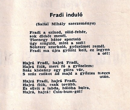 Három év után ismét zengett a Hajrá Fradi, Hajrá Fradi, Hajrá Fiúk csak tovább! Aztán süví­tett a labda, a hálóba balra és zúgott a Hajrá, Hajrá FTC! Igaz induló volt ez a múltban, igaz ma is, és igaz marad minaddig, mí­g a Földön ember lesz!