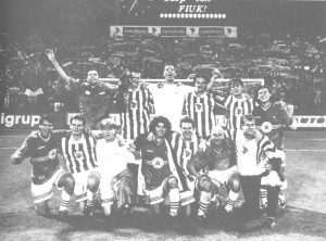 1996.10.15. Ferencváros – Newcastle 3:2 Állnak (balról): Nyilas, Kuznyecov, Hrutka, Horváth F., Nagy N. Holló. Elől: Zavadszky, Telek, Nicsenko, Lisztes, Szűcs M., Miriuta, Szeiler
