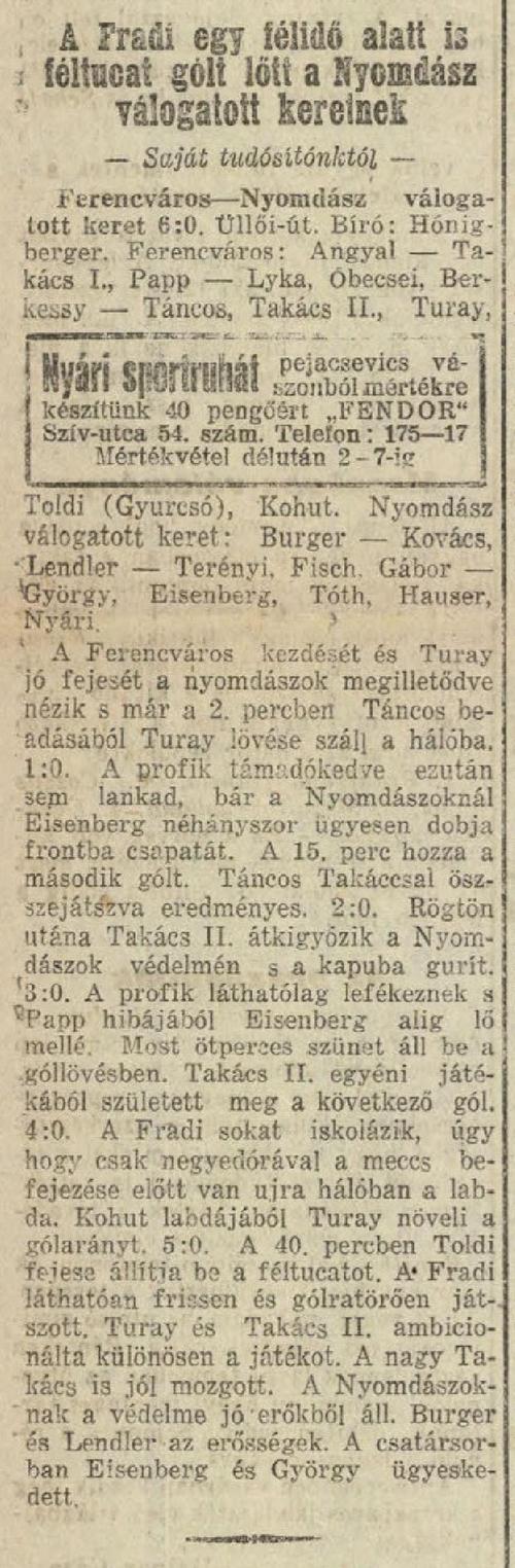 1930.VIII.21. Ferencváros – Nyomdász válogatott keret 6:0 (edzőmérkőzés)