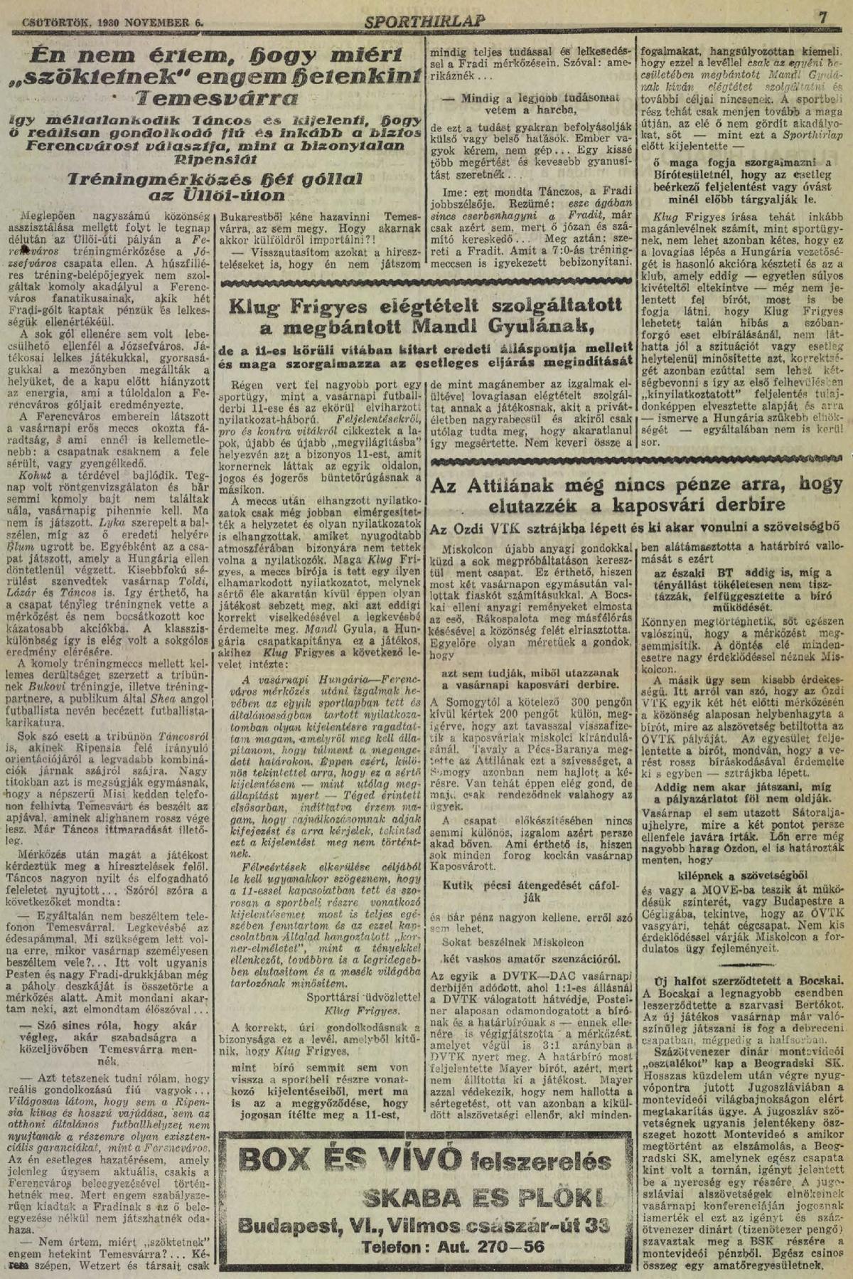 1930.XI.5. Ferencváros – Józsefváros 7:0 (edzőmérkőzés)