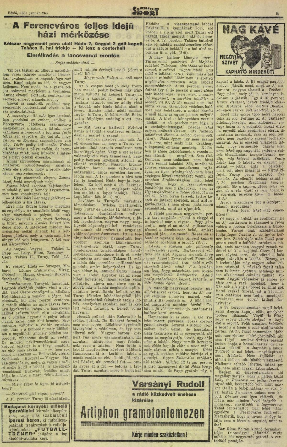 1931.I.25. Ferencváros A) – Ferencváros B) 6:3 (edzőmérkőzés)