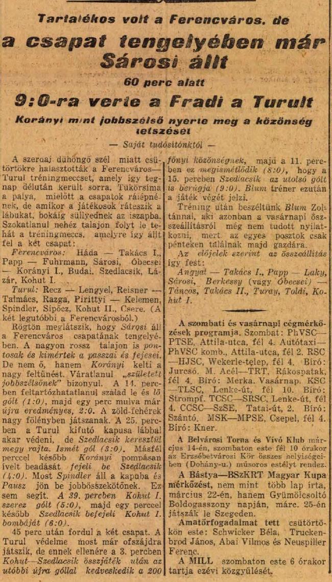 1931.III.12. Ferencváros – Turul 9:0 (edzőmérkőzés)