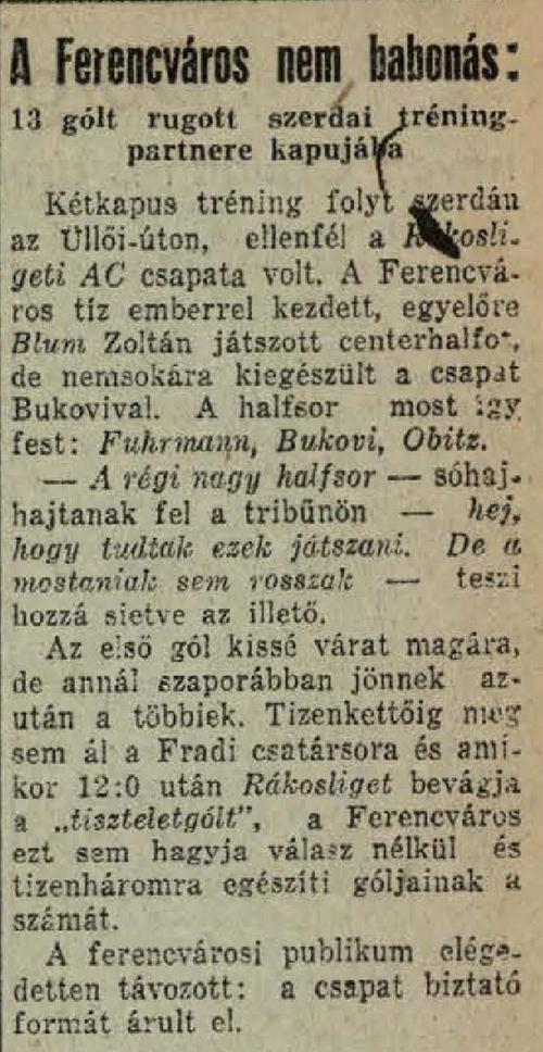 1931.IX.16. Ferencváros – Rákosligeti AC 13:1 (edzőmérkőzés)