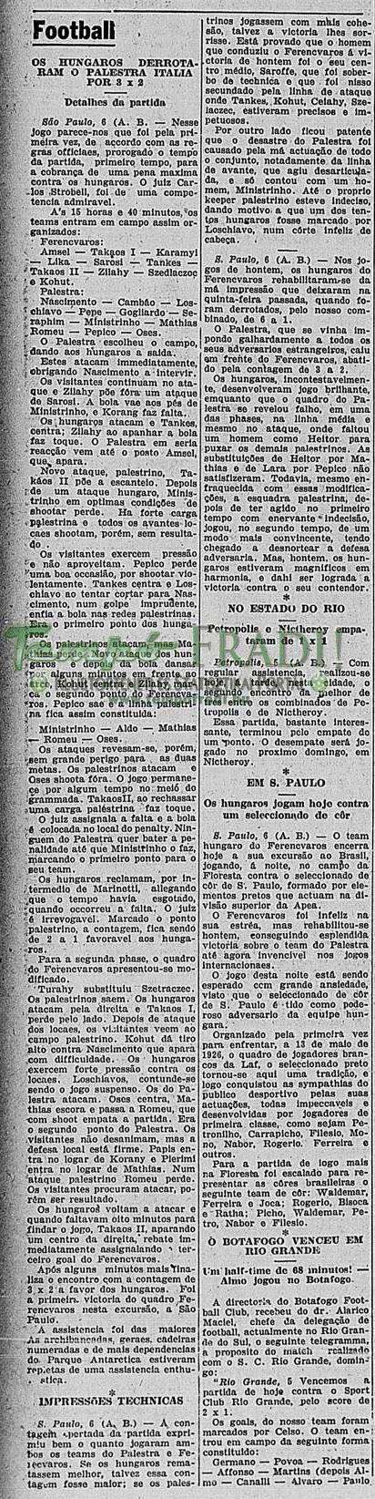 1931.VII.5. Palestra Italia – Ferencváros 2:3 Közzétéve: 2009. január 31. szombat | Szerző: K@rcsi A két év előtti vereségért tegnap revansot vett a Fradi (Brazil fotók és újságcikkek: Miro Moraes gyűjteményéből) Vélemény, hozzászólás? Válasz megszakításaAz e-mail címet nem tesszük közzé. A kötelező mezőket * karakterrel jelöltük Hozzászólás * Név * E-mail cím * Honlap Δ