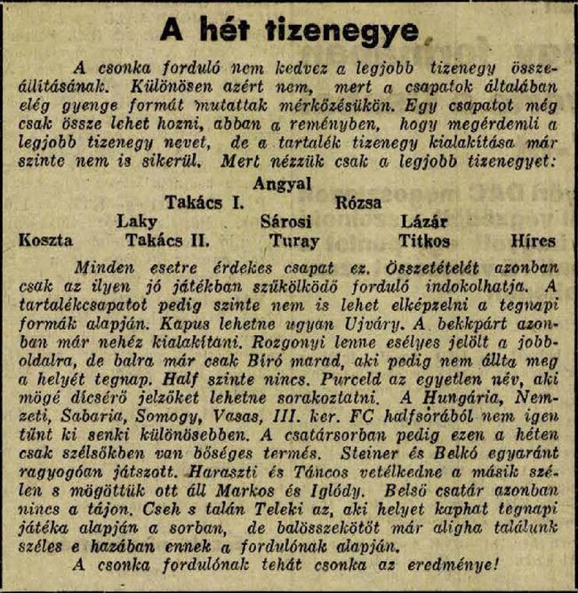 1931.X.18. Ferencváros – Nemzeti 7:0 Közzétéve: 2009. január 31. szombat | Szerző: K@rcsi A Ferencváros idei gólrekordot állított fel a tegnapi mérkőzésén és tovább vezet a bajnokságban A »gyengélkedő« Nemzeti ellen teljes fényében csillogott a Ferencváros játéka Vélemény, hozzászólás? Válasz megszakításaAz e-mail címet nem tesszük közzé. A kötelező mezőket * karakterrel jelöltük Hozzászólás * Név * E-mail cím * Honlap Δ