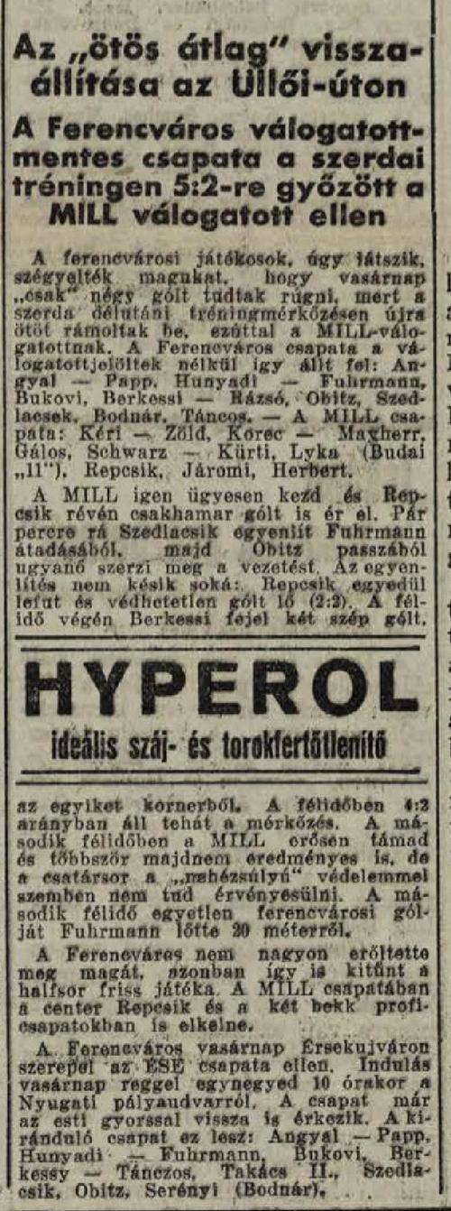 1932.IV.20. Ferencváros – MILL-válogatott 5:2 (edzőmérkőzés)
