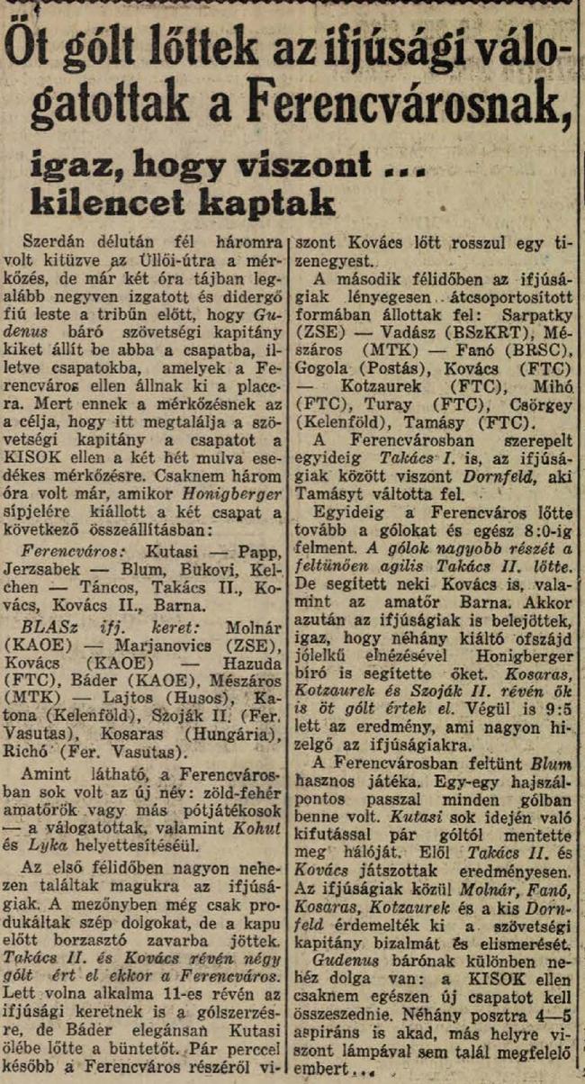 1932.X.26. Ferencváros – BLASZ ifj.-keret 9:5 (edzőmérkőzés)