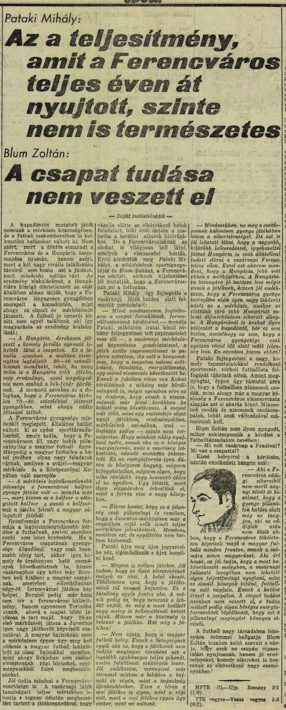 Már a Nemzeti Sport címlapja is azzal kezdte a beszámolóját, hogy a Ferencváros messze elmaradt az igazi formájától és csak a Hungária csatárainak tehetetlensége mentette meg a csapatot a vereségtől. Érdemes végigolvasni a mérkőzésről szóló írást, mert a tudósító nem nagyon spórolt a fanyar jelzőivel. Bírálta a csapatokat, mert a játékosok nem gentlemanként viselkednek egymással. Kíváncsi lennék vajon miket írt volna az emlékezetes Kispest elleni kupadöntőről, amikor a játékosok a szurkolókkal és a rendőrökkel vívtak emlékezetes birkózópárbajt!