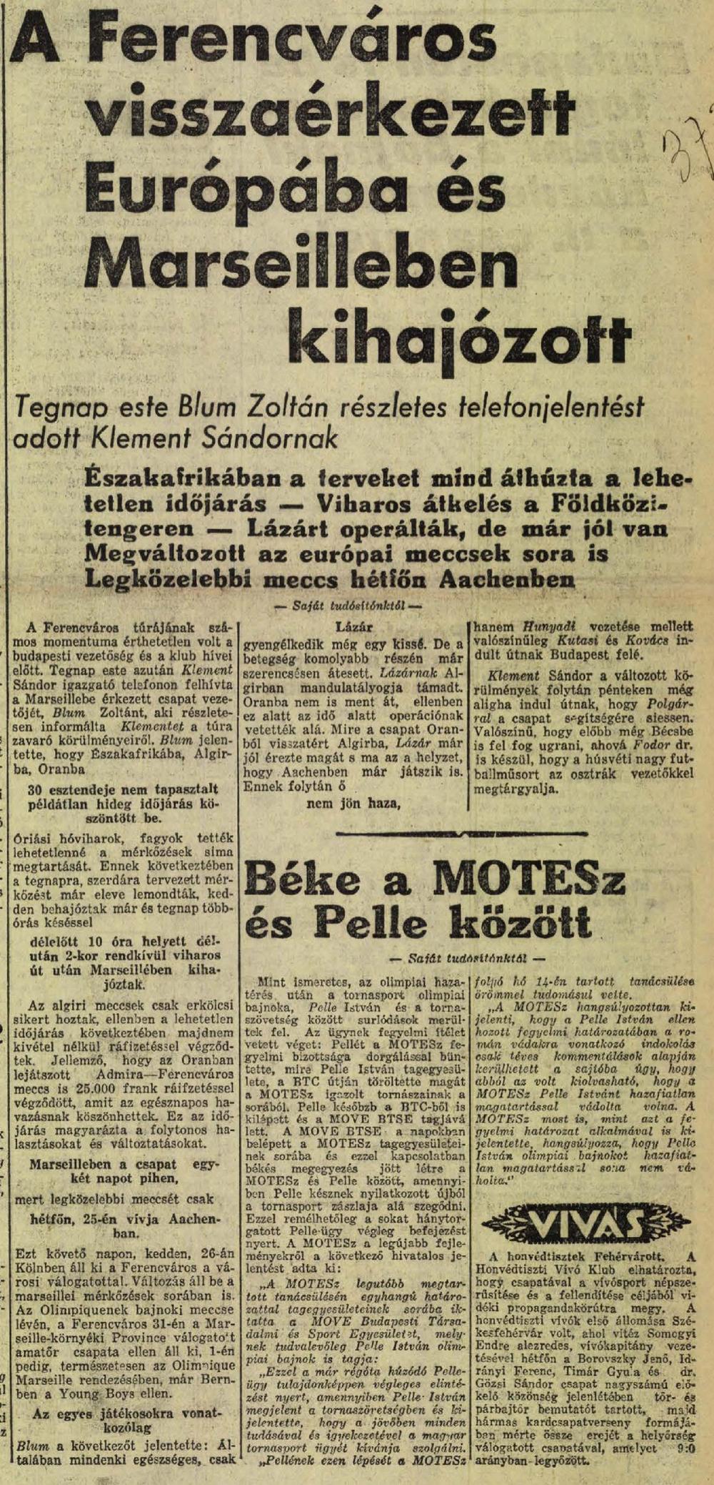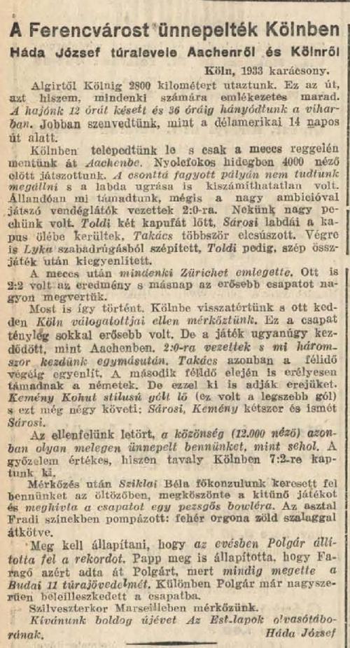 1933.XII.25. Aachen válogatott – Ferencváros 2:2 Közzétéve: 2009. február 2. hétfő | Szerző: K@rcsi A hosszú hajózás és vasutazás után vasárnap Aachenben csak döntetlent ért el a Ferencváros Vélemény, hozzászólás? Válasz megszakításaAz e-mail címet nem tesszük közzé. A kötelező mezőket * karakterrel jelöltük Hozzászólás * Név * E-mail cím * Honlap Δ