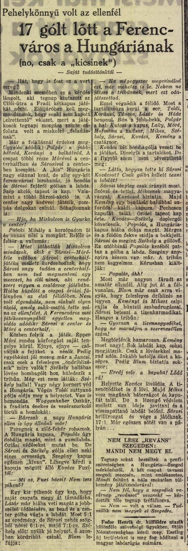 1934.IX.12. Ferencváros – Hungária SC 17:1 (edzőmérkőzés)