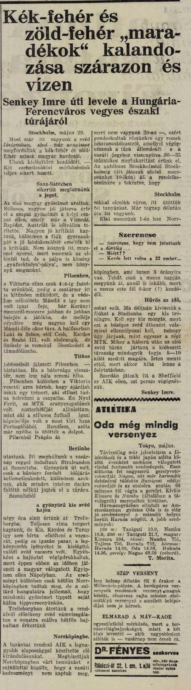 1934.V.24. SV Saaz – Ferencváros, Hungária vegyes 2:4 Közzétéve: 2009. február 3. kedd | Szerző: K@rcsi Győzelemmel kezdte túráját a Ferencváros-Hungária vegyes csapat Egy hozzászólás a(z) 11110001110ejegyzéshez admin on 2025. január 2. csütörtök - 14:25 Az északi túrára utazó Hungária, Ferencváros vegyes csapatot csak ma jelöli ki a két egyesület vezetősége a következő játékosokból: Újvári, Mándi, Kis, Egri, Sebes, Cseh, Turay, Szabó III., Titkos, Kardos (Hungária), Kutasi, Korányi, Laki, Móré, Táncos, Székely (Ferencváros). Nemzeti Sport, 1934. május 18. Vélemény, hozzászólás? Válasz megszakításaAz e-mail címet nem tesszük közzé. A kötelező mezőket * karakterrel jelöltük Hozzászólás * Név * E-mail cím * Honlap Δ
