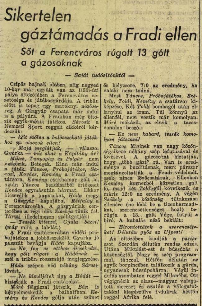 1934.XII.2. Ferencváros – Gázgyár 13:0 (edzőmérkőzés)