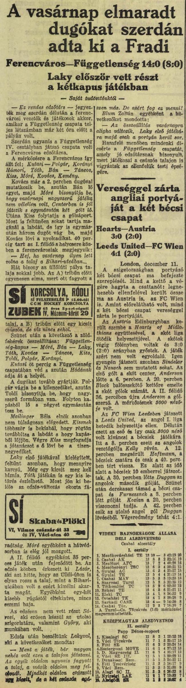 1935.XII.11. Ferencváros – Függetlenség 14:0 (edzőmérkőzés)