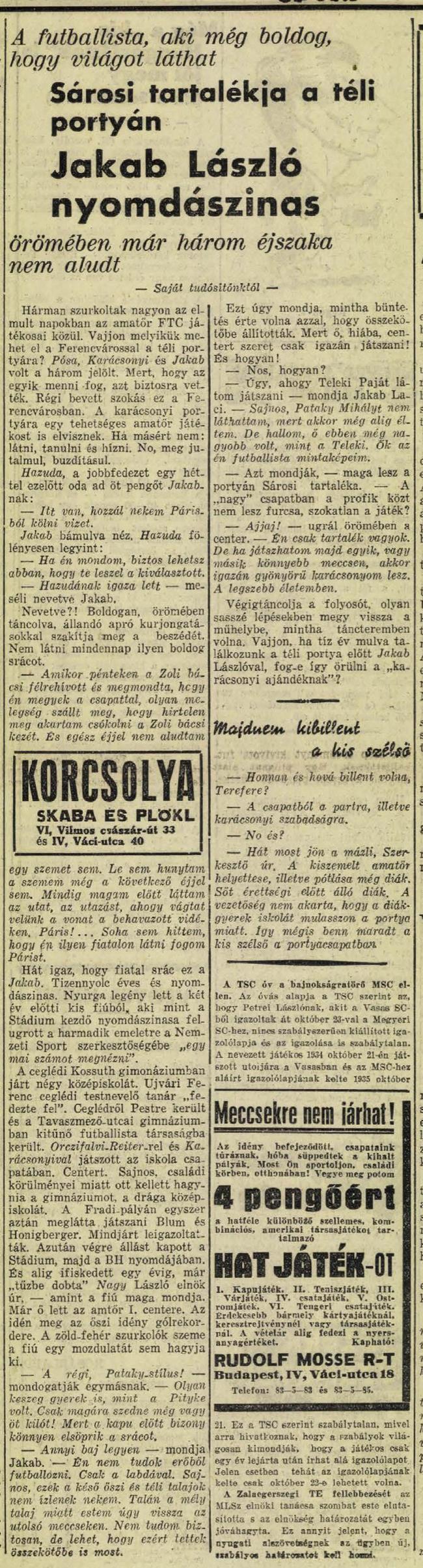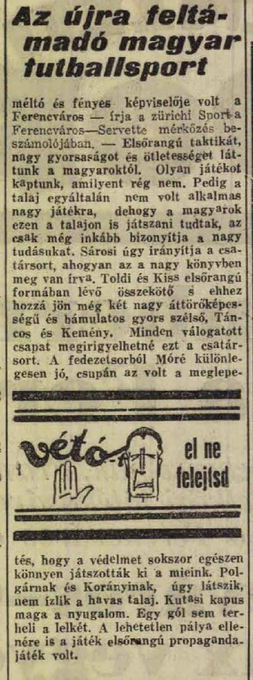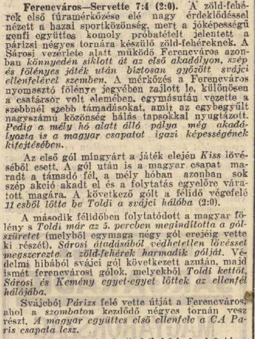 • „… a Ferencváros portyacsapatát szerdán késő éjjel, Sárosi dr. ünneplése után, állították össze. Az összeállítás: Kutasi — Polgár, Korányi — Hámori, Móré, Lázár — Táncos, Kiss, Sárosi, Toldi, Kemény. Tartalék: Bán, Mikes, Jakab. Ez a 14 játékos megy a portyára KlementSándor és BlumZoltán vezetése mellett.”