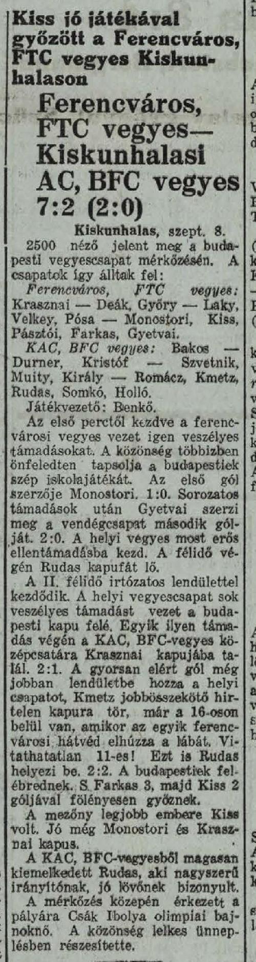 1936.IX.8. Váci SE – Ferencváros 3:5 (edzőmérkőzés)