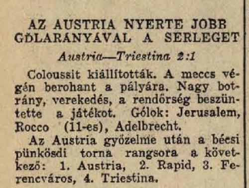 1936.VI.1. Pünkösdi torna, Rapid – Ferencváros 5:3 Közzétéve: 2009. február 5. csütörtök | Szerző: K@rcsi 2:0-ra vezetett az I. félidőben a Ferencváros, mégis itt vesztette el a mérkőzést Vélemény, hozzászólás? Válasz megszakításaAz e-mail címet nem tesszük közzé. A kötelező mezőket * karakterrel jelöltük Hozzászólás * Név * E-mail cím * Honlap Δ