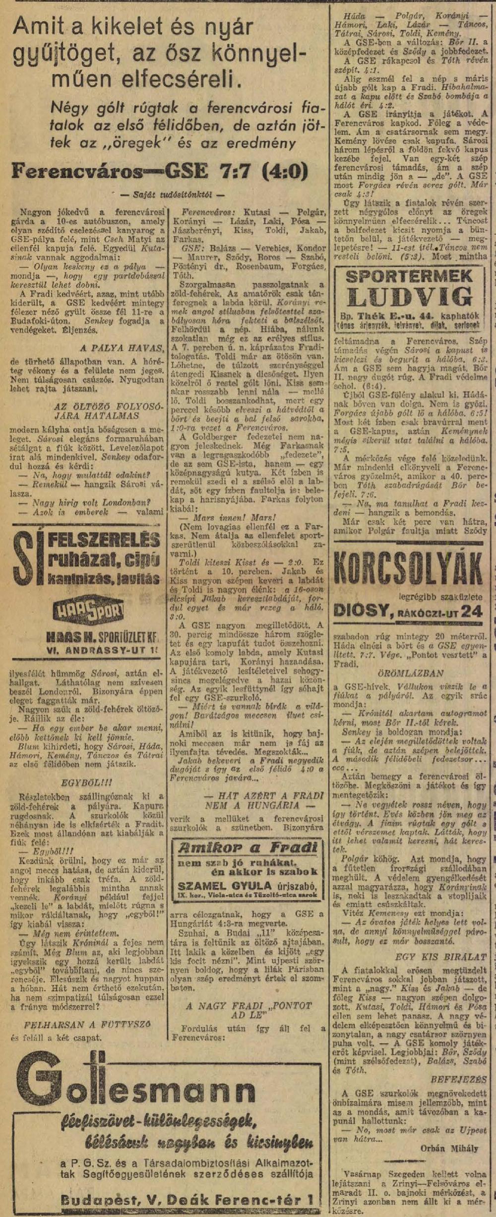 1936.XII.13. GSE – Ferencváros 7:7 (edzőmérkőzés)