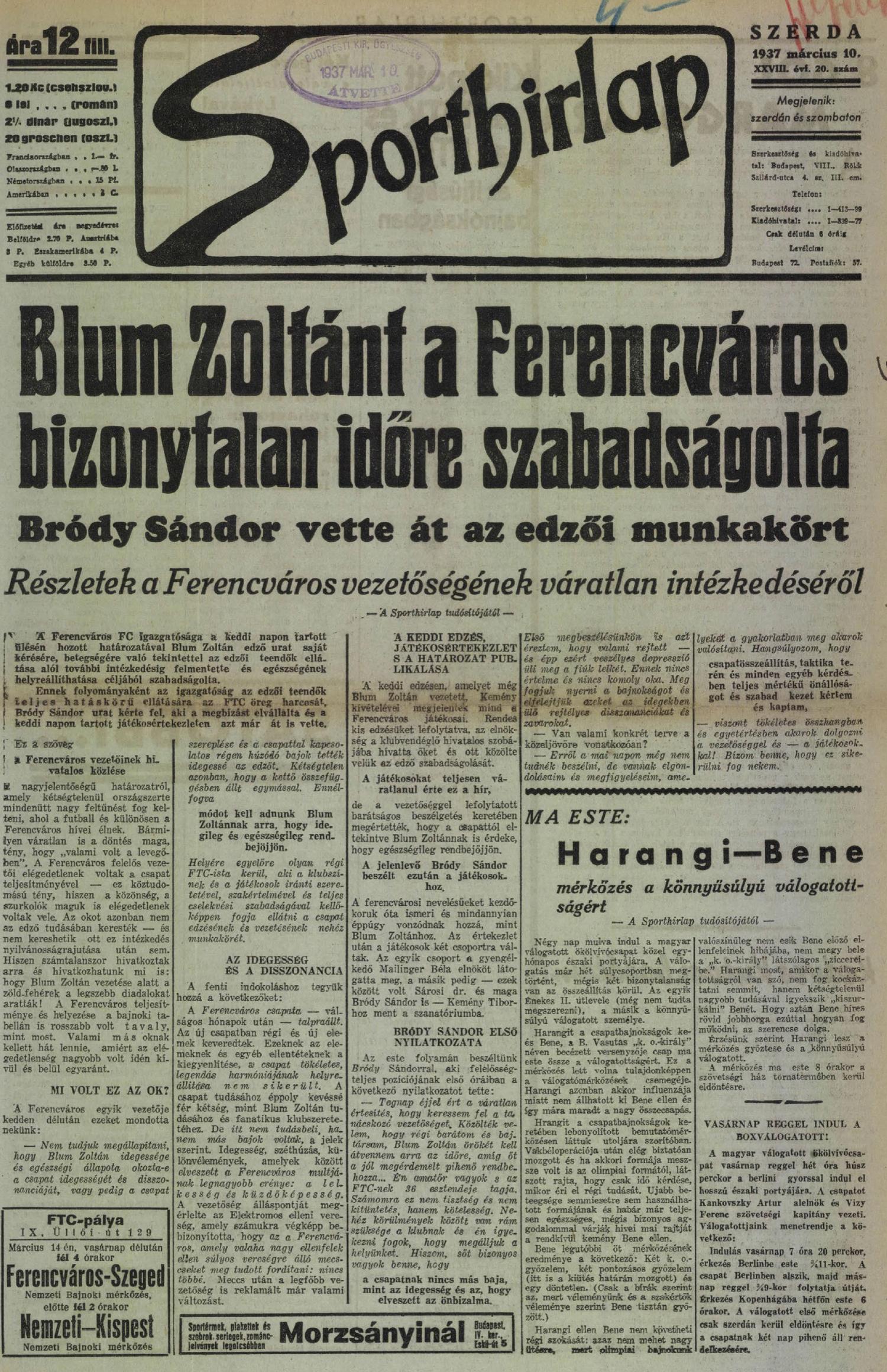 « 1937.III.3. Ferencváros – Hatvani Vasutas 10:1 (edzőmérkőzés) 1937.III.10. Ferencváros – ZSTE 13:0 (edzőmérkőzés) »