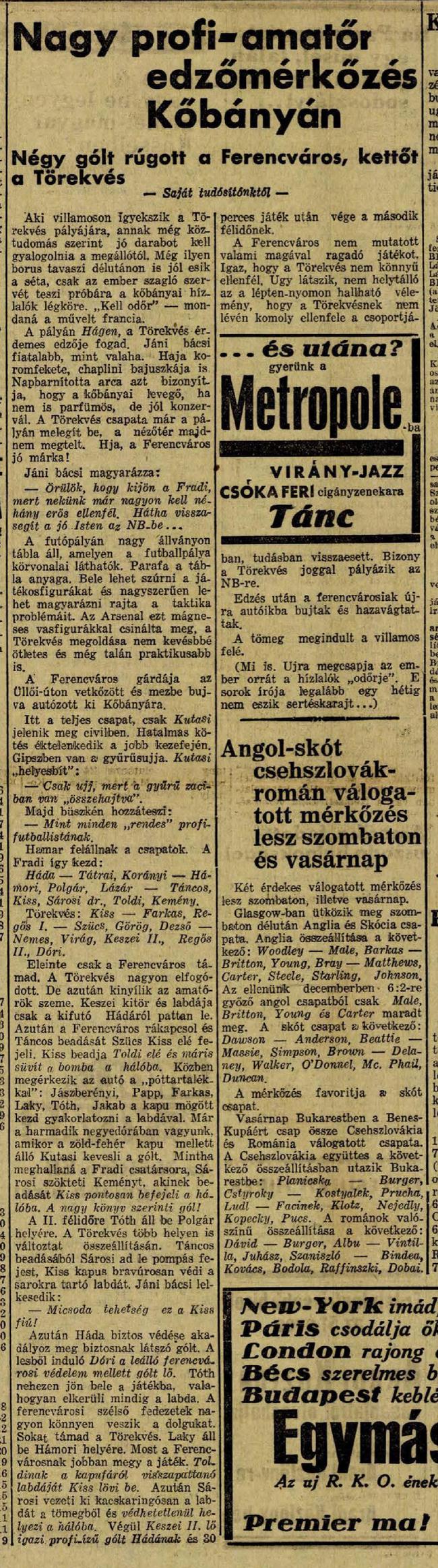 1937.IV.14. Törekvés – Ferencváros 2:4 (edzőmérkőzés)