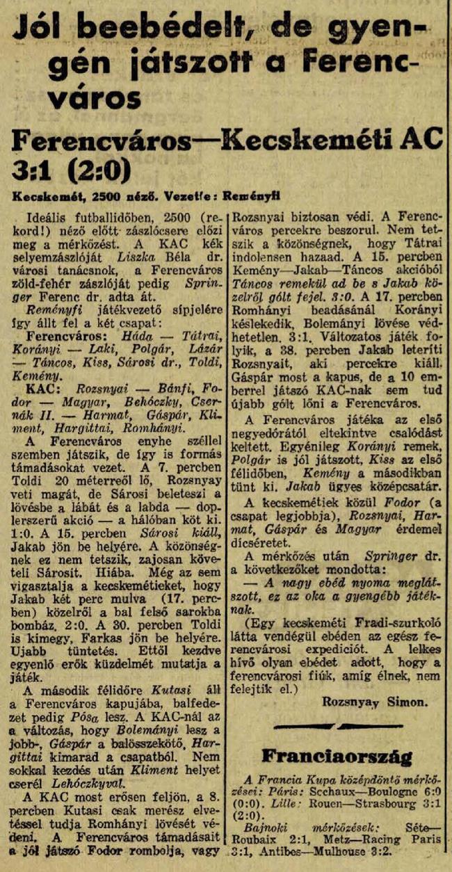 1937.IV.5. Kecskeméti AC – Ferencváros 1:3 (edzőmérkőzés)