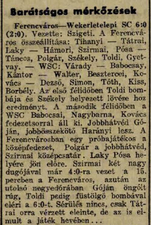 1937.IX.19. Wekerletelepi SC – Ferencváros 0:6 (edzőmérkőzés)