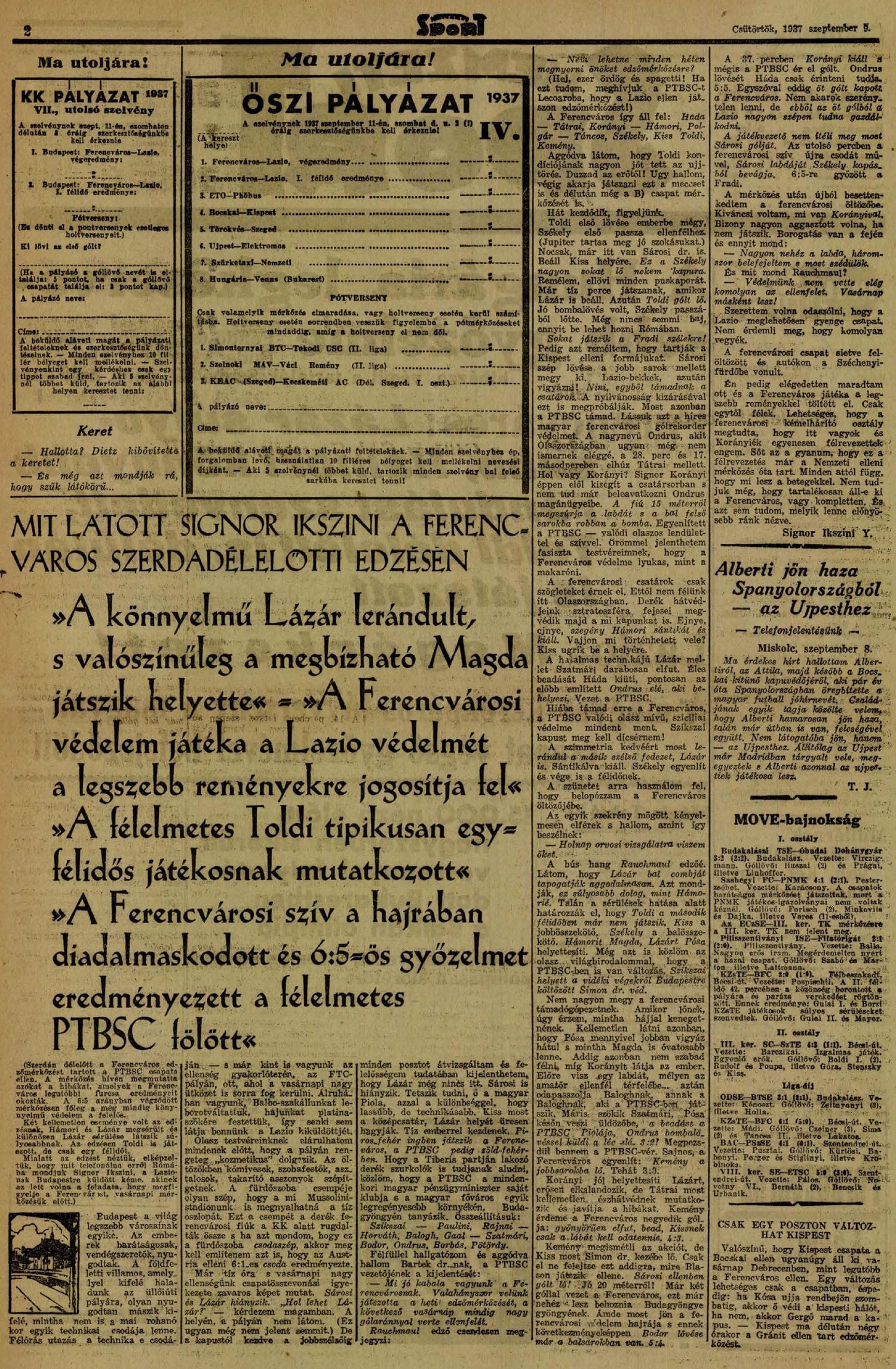1937.IX.8. Ferencváros – PTBSC 6:5 (edzőmérkőzés)