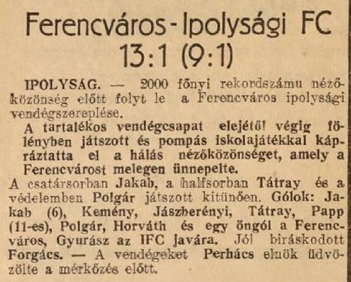 Délszlovenszkó legnagyobb sporteseménye folyik levasárnap Ipolyságon. A Ferencváros Sándor edző vezetése mellett a következő csapattal érkezik meg: Háda, Tátrai, Pap, Polgár, Pósa, Gyetvay, Farkas, Táncos, Kiss, Jászberényi, Jakab és Kemény. Az IFC megerősített felállításban szerepel a nemes ellenfél ellen. — A mérkőzés előtt ünnepség lesz a futballpályán, utána pedig bankét a Ferencváros tiszteletére.