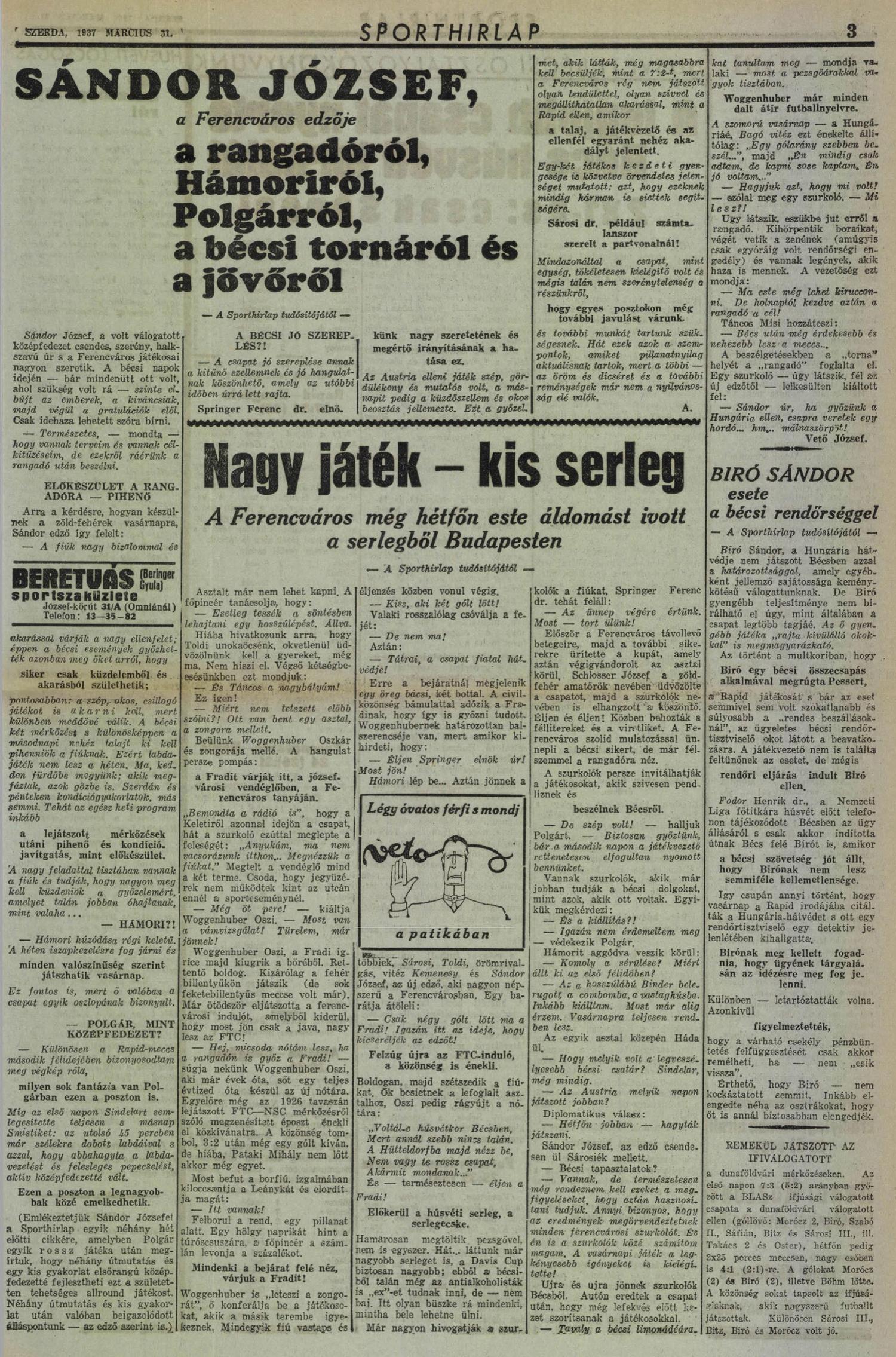 1937.III.29. Húsvéti torna, Rapid – Ferencváros 2:4 Közzétéve: 2009. február 6. péntek | Szerző: K@rcsi Kemény dió volt a Rapid, de a Ferencváros feltörte Egy hozzászólás a(z) 11110010001ejegyzéshez lacimadár on 2012. november 12. hétfő - 18:53 Micsoda siker! Két európai élcsapat ellen 2 nap alatt 11 gól! Ez is számlálhatatlan kupagyőzelmeink közé tartozik. Vélemény, hozzászólás? Válasz megszakításaAz e-mail címet nem tesszük közzé. A kötelező mezőket * karakterrel jelöltük Hozzászólás * Név * E-mail cím * Honlap Δ