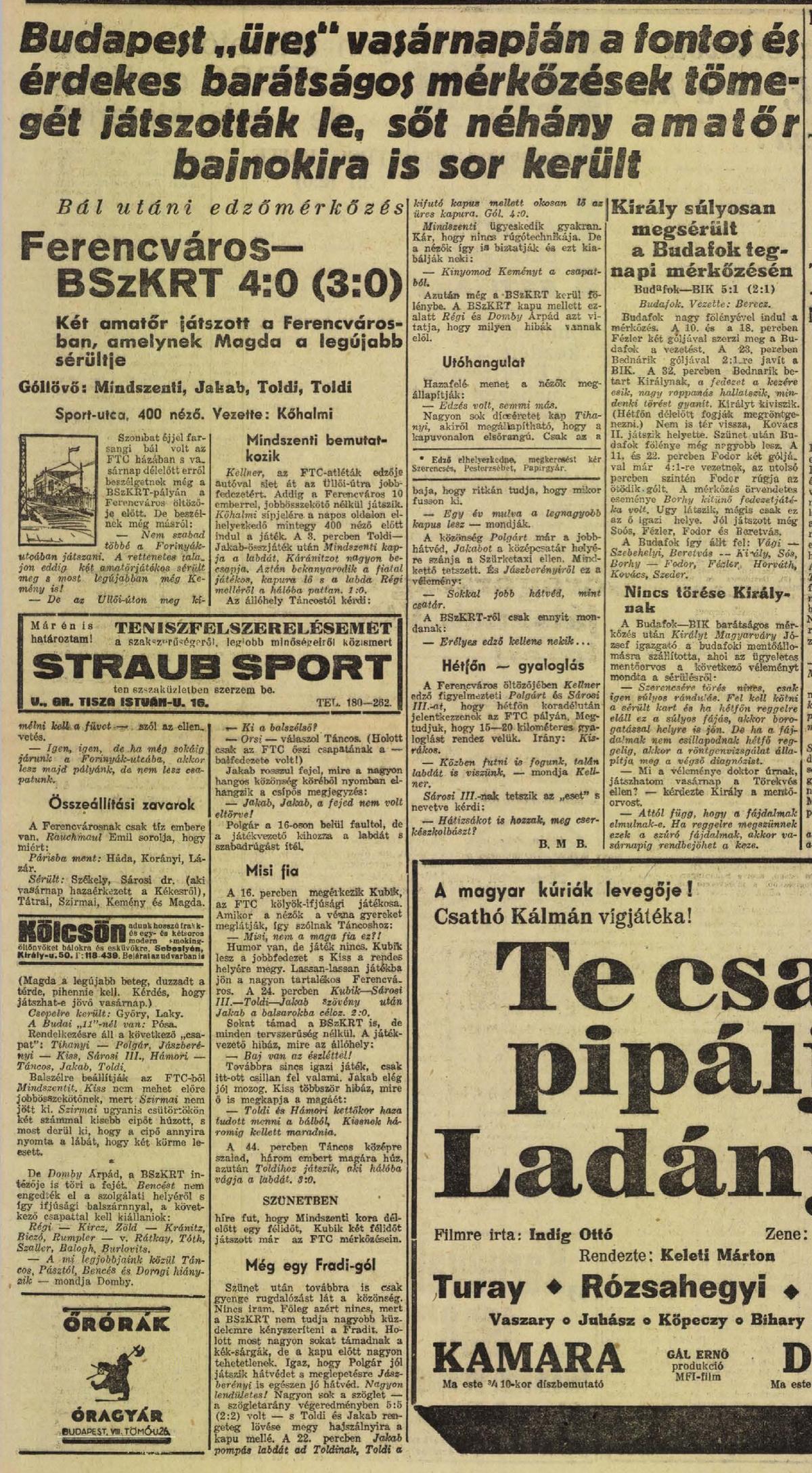 1938.II.20. BSzKRT – Ferencváros 0:4 (edzőmérkőzés)