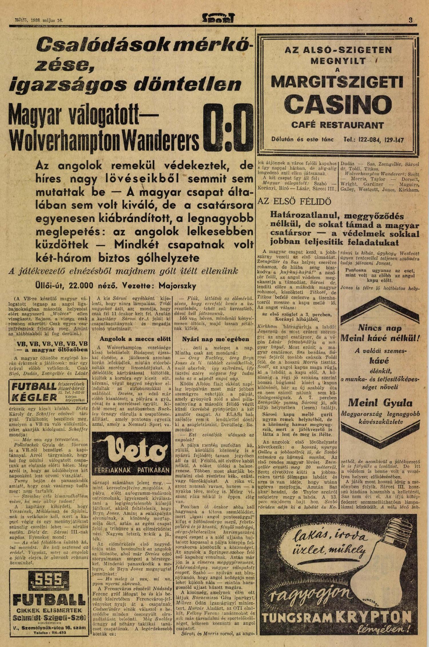 1938.V.15. Magyar válogatott – Wolverhampton Wanderers 0:0